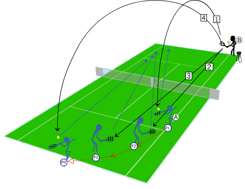 - B envoie un lob à la position P4. Le joueur A doit reculer à la position P4 et smasher le lob de B. Puis on revient à la position P1 et on recommence.