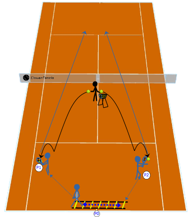 - Je fais l'échelle de rythme dans un sens puis mon entraîneur envoie une balle sur mon coup droit et je la frappe